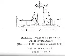Ohain et son mécanicien Max Hahn formaient un département à eux seuls au sein de la société Heinkel[6]. Le premier moteur, désigné Heinkel HeS 1, tournait déjà au banc en 1937. Les projets suivants culminèrent dans le moteur Heinkel HeS 3, qui fournissait 550 kgf (env. 5,4 kN) de poussée et fut avionné dans la cellule construite tout exprès du Heinkel He 178.