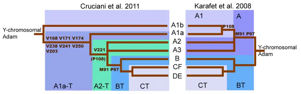 The revised y-chromosome family tree by Fulvio Cruciani et al. 2011 compared with the family tree from Karafet et al. 2008