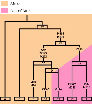 La plupart des lignages mâles DE font partie, soit de l'haplogroupe D, peut-être originaire d'Asie, la seule zone où il a été trouvé[3], soit de l'haplogroupe E, qu'on croit originaire d'Afrique de l'Est[4],[5] ou du Proche-Orient[6]. On classe le reste des lignages dans le paragroupe DE*, dont les cas confirmés sont extrêmement rares.