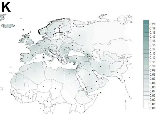 K semble être le plus fréquent dans le Morbihan (17,5 %) et le Périgord-Limousin (15,3 %) en France, ainsi qu'en Norvège et en Bulgarie (13,3 %). Le niveau est de 12,5 % en Belgique, 11 % en Géorgie et 10 % en Autriche et en Grande-Bretagne.