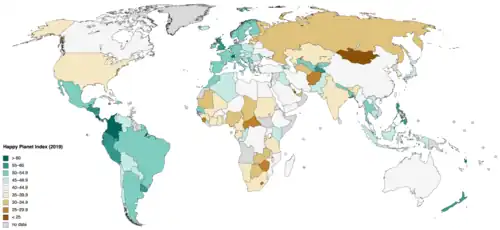 Carte du Happy Planet Index en 2019. Les pays les mieux classés sont en vert; les pays les moins bien classés en marron.