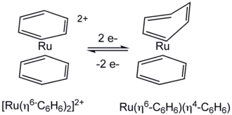 L'hapticité d'un ligand peut changer au cours d'une réaction chimique, par exemple lors d'une oxydo-réduction[8]: