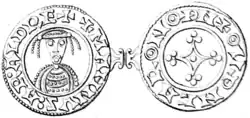 Une pièce frappée sous le règne de Harald. Le triquetra, symbole à la fois chrétien et païen utilisé par Knut le Grand et ses fils, est vraisemblablement repris par Harald dans le cadre de ses prétentions danoises.