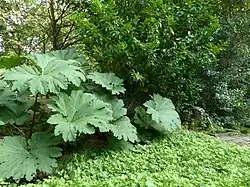 L'ensemble du site est arboré d'espèces rares comptant des spécimens âgés, dont un tilleul de plus de 200 ans[41]. Sur 23 hectares, le parc arboré partiellement classé comme « espace boisé protégé » contient aussi des rosiers dans la cour d'honneur, des pins de Monterey, de l'alisier blanc, de la Gunnera manicata, des frênes, du hêtre pourpre et un cèdre du Liban[H 6]. Des camélias fleurissent périodiquement[40]. Une fontaine sculptée en forme de gueule de lion fournit de l'eau toute l'année[40].