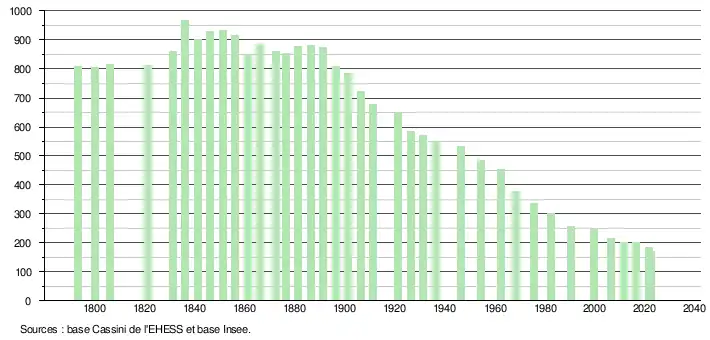 L'évolution du nombre d'habitants est connue à travers les recensements de la population effectués dans la commune depuis 1793. Pour les communes de moins de 10 000 habitants, une enquête de recensement portant sur toute la population est réalisée tous les cinq ans, les populations de référence des années intermédiaires étant quant à elles estimées par interpolation ou extrapolation[18]. Pour la commune, le premier recensement exhaustif entrant dans le cadre du nouveau dispositif a été réalisé en 2006[19].