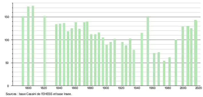 L'évolution du nombre d'habitants est connue à travers les recensements de la population effectués dans la commune depuis 1793. Pour les communes de moins de 10 000 habitants, une enquête de recensement portant sur toute la population est réalisée tous les cinq ans, les populations de référence des années intermédiaires étant quant à elles estimées par interpolation ou extrapolation[7]. Pour la commune, le premier recensement exhaustif entrant dans le cadre du nouveau dispositif a été réalisé en 2005[8].