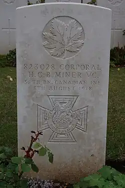 Le caporal Miner s'est ensuite précipité seul sur un poste de bombardement ennemi, lançant à baïonnette deux de la garnison et mettant le reste en vol. Il a été mortellement blessé dans l'exécution de cet acte courageux.