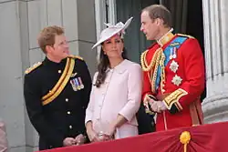 Le prince Harry en compagnie du duc et de la duchesse de Cambridge au balcon du palais de Buckingham lors du Trooping the Colour de 2013.