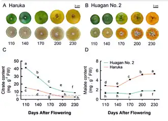 'Haruka' accumule en regard de sa faiblesse en citrate des niveaux relativement élevés de malate (5,2 mg/g−1, l'acide L-malique donne le gout agréable des pommes, des poires, etc.). Une publication chinoise (2025) a décrit les mécanismes de transcription des gènes responsables: CsCit et CsALMT9 chez Haruka. Des facteurs épigénétiques tels que l'ombrage de la plante contrarient leur régulation, la baisse de l'intensité lumineuse augmente la teneur en citrate et l'acidité titrable des fruits et diminué la teneur en malate des fruits. Les auteurs écrivent «à l'heure actuelle, le fruit 'Haruka' est peut-être la seule variété qui accumule jusqu'à 4 fois plus de malate à maturité que les agrumes courants...'Haruka' est un cultivar unique qui présente des profils de citrate et de malate rares dans les fruits à maturité»[14].
