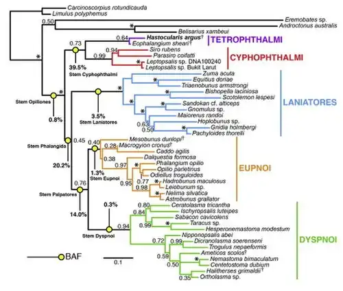 Dans l'arbre phylogénétique de Garwood et al. en 2014, la base des Opiliones se divise entre les « Phalangida » et les Cyphophthalmi. La branche des Cyphophthalmi se divise ensuite entre les Cyphophthalmi proprement dits et les Tetrophthalmi, tandis que les Phalangida se divisent entre les Laniatores et les « Palpatores ». Les Palpatores se divisent finalement entre les Eupnoi et les Dyspnoi. Cette analyse déplace la divergence des sous-ordres actuels du Dévonien au Carbonifère. La divergence des opilions est datée de 414 millions d'années et l'origine des arachnides est située à la fin du Cambrien ou au début de l'Ordovicien[1].