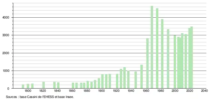 L'évolution du nombre d'habitants est connue à travers les recensements de la population effectués dans la commune depuis 1793. Pour les communes de moins de 10 000 habitants, une enquête de recensement portant sur toute la population est réalisée tous les cinq ans, les populations de référence des années intermédiaires étant quant à elles estimées par interpolation ou extrapolation[28]. Pour la commune, le premier recensement exhaustif entrant dans le cadre du nouveau dispositif a été réalisé en 2004[29].