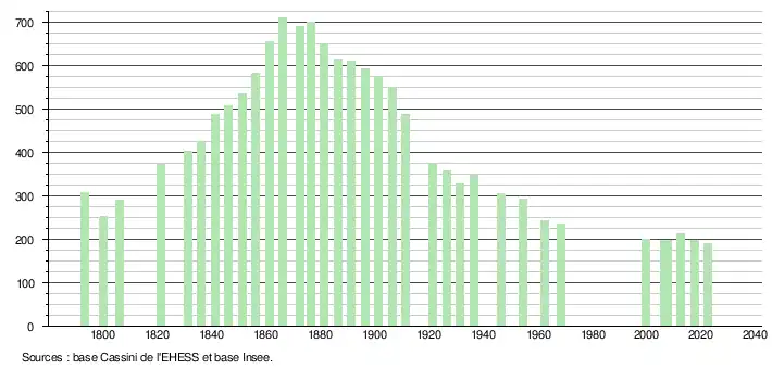 L'évolution du nombre d'habitants est connue à travers les recensements de la population effectués dans la commune depuis 1793. Pour les communes de moins de 10 000 habitants, une enquête de recensement portant sur toute la population est réalisée tous les cinq ans, les populations de référence des années intermédiaires étant quant à elles estimées par interpolation ou extrapolation[22]. Pour la commune, le premier recensement exhaustif entrant dans le cadre du nouveau dispositif a été réalisé en 2007[23].