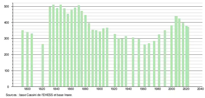L'évolution du nombre d'habitants est connue à travers les recensements de la population effectués dans la commune depuis 1793. Pour les communes de moins de 10 000 habitants, une enquête de recensement portant sur toute la population est réalisée tous les cinq ans, les populations de référence des années intermédiaires étant quant à elles estimées par interpolation ou extrapolation[17]. Pour la commune, le premier recensement exhaustif entrant dans le cadre du nouveau dispositif a été réalisé en 2005[18].
