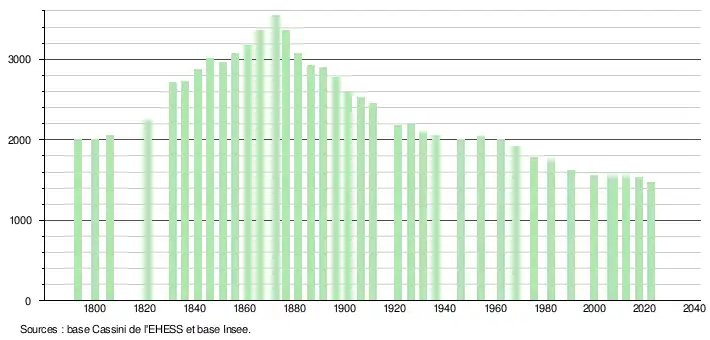 L'évolution du nombre d'habitants est connue à travers les recensements de la population effectués dans la commune depuis 1793. Pour les communes de moins de 10 000 habitants, une enquête de recensement portant sur toute la population est réalisée tous les cinq ans, les populations de référence des années intermédiaires étant quant à elles estimées par interpolation ou extrapolation[23]. Pour la commune, le premier recensement exhaustif entrant dans le cadre du nouveau dispositif a été réalisé en 2007[24].