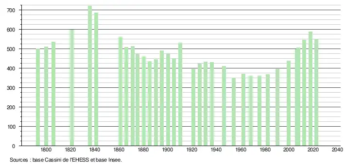 L'évolution du nombre d'habitants est connue à travers les recensements de la population effectués dans la commune depuis 1793. Pour les communes de moins de 10 000 habitants, une enquête de recensement portant sur toute la population est réalisée tous les cinq ans, les populations de référence des années intermédiaires étant quant à elles estimées par interpolation ou extrapolation[22]. Pour la commune, le premier recensement exhaustif entrant dans le cadre du nouveau dispositif a été réalisé en 2007[23].