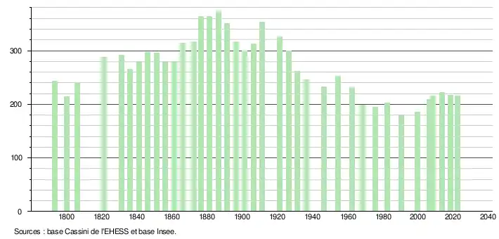 L'évolution du nombre d'habitants est connue à travers les recensements de la population effectués dans la commune depuis 1793. Pour les communes de moins de 10 000 habitants, une enquête de recensement portant sur toute la population est réalisée tous les cinq ans, les populations de référence des années intermédiaires étant quant à elles estimées par interpolation ou extrapolation[40]. Pour la commune, le premier recensement exhaustif entrant dans le cadre du nouveau dispositif a été réalisé en 2008[41].