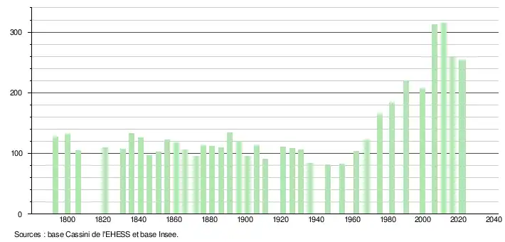 - ↑ Fiches Insee - Populations de référence de la commune pour les années 2006, 2007, 2008, 2009, 2010, 2011, 2012, 2013, 2014, 2015, 2016, 2017, 2018, 2019, 2020, 2021 et 2022.