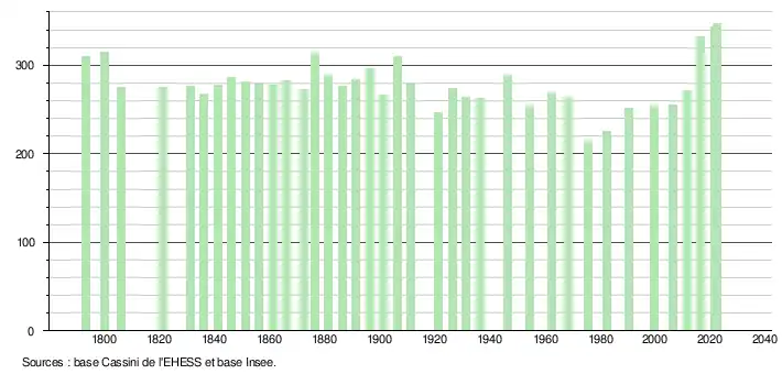 L'évolution du nombre d'habitants est connue à travers les recensements de la population effectués dans la commune depuis 1793. Pour les communes de moins de 10 000 habitants, une enquête de recensement portant sur toute la population est réalisée tous les cinq ans, les populations de référence des années intermédiaires étant quant à elles estimées par interpolation ou extrapolation[20]. Pour la commune, le premier recensement exhaustif entrant dans le cadre du nouveau dispositif a été réalisé en 2006[21].