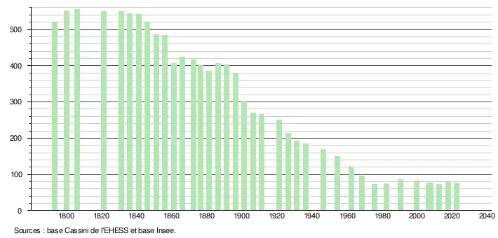 L'évolution du nombre d'habitants est connue à travers les recensements de la population effectués dans la commune depuis 1793. Pour les communes de moins de 10 000 habitants, une enquête de recensement portant sur toute la population est réalisée tous les cinq ans, les populations de référence des années intermédiaires étant quant à elles estimées par interpolation ou extrapolation[12]. Pour la commune, le premier recensement exhaustif entrant dans le cadre du nouveau dispositif a été réalisé en 2007[13].