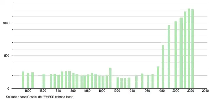 L'évolution du nombre d'habitants est connue à travers les recensements de la population effectués dans la commune depuis 1793. Pour les communes de moins de 10 000 habitants, une enquête de recensement portant sur toute la population est réalisée tous les cinq ans, les populations de référence des années intermédiaires étant quant à elles estimées par interpolation ou extrapolation[14]. Pour la commune, le premier recensement exhaustif entrant dans le cadre du nouveau dispositif a été réalisé en 2007[15].