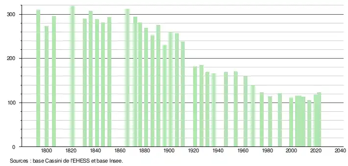 L'évolution du nombre d'habitants est connue à travers les recensements de la population effectués dans la commune depuis 1793. Pour les communes de moins de 10 000 habitants, une enquête de recensement portant sur toute la population est réalisée tous les cinq ans, les populations de référence des années intermédiaires étant quant à elles estimées par interpolation ou extrapolation[19]. Pour la commune, le premier recensement exhaustif entrant dans le cadre du nouveau dispositif a été réalisé en 2004[20].