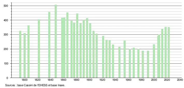 L'évolution du nombre d'habitants est connue à travers les recensements de la population effectués dans la commune depuis 1793. Pour les communes de moins de 10 000 habitants, une enquête de recensement portant sur toute la population est réalisée tous les cinq ans, les populations de référence des années intermédiaires étant quant à elles estimées par interpolation ou extrapolation[15]. Pour la commune, le premier recensement exhaustif entrant dans le cadre du nouveau dispositif a été réalisé en 2007[16].