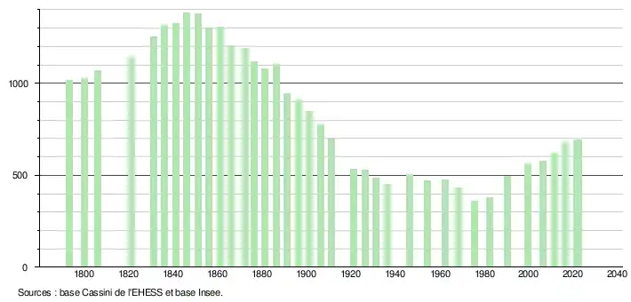 L'évolution du nombre d'habitants est connue à travers les recensements de la population effectués dans la commune depuis 1793. Pour les communes de moins de 10 000 habitants, une enquête de recensement portant sur toute la population est réalisée tous les cinq ans, les populations de référence des années intermédiaires étant quant à elles estimées par interpolation ou extrapolation[16]. Pour la commune, le premier recensement exhaustif entrant dans le cadre du nouveau dispositif a été réalisé en 2006[17].