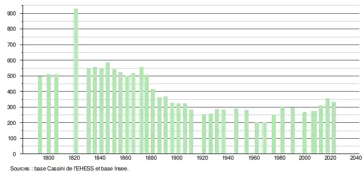 L'évolution du nombre d'habitants est connue à travers les recensements de la population effectués dans la commune depuis 1793. Pour les communes de moins de 10 000 habitants, une enquête de recensement portant sur toute la population est réalisée tous les cinq ans, les populations de référence des années intermédiaires étant quant à elles estimées par interpolation ou extrapolation[19]. Pour la commune, le premier recensement exhaustif entrant dans le cadre du nouveau dispositif a été réalisé en 2007[20].