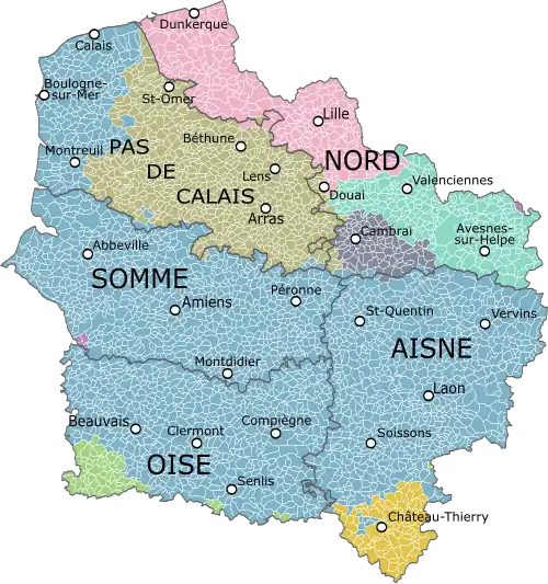 Elle s'étend sur 31 806 km2 et compte cinq départements : l'Aisne, le Nord, l'Oise, le Pas-de-Calais et la Somme. Son chef-lieu est Lille, principale ville de la région et auparavant déjà chef-lieu du Nord-Pas-de-Calais. Amiens, chef-lieu de l'ancienne Picardie, est la deuxième ville de la région.