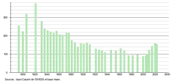 L'évolution du nombre d'habitants est connue à travers les recensements de la population effectués dans la commune depuis 1793. Pour les communes de moins de 10 000 habitants, une enquête de recensement portant sur toute la population est réalisée tous les cinq ans, les populations de référence des années intermédiaires étant quant à elles estimées par interpolation ou extrapolation[25]. Pour la commune, le premier recensement exhaustif entrant dans le cadre du nouveau dispositif a été réalisé en 2004[26].