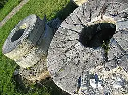 Une meule (en bas à droite), le moulin (à droite) et la maison du meunier (à gauche). | |