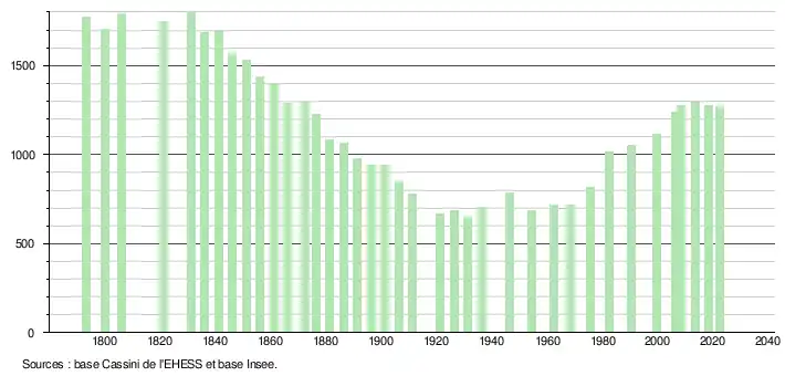 L'évolution du nombre d'habitants est connue à travers les recensements de la population effectués dans la commune depuis 1793. Pour les communes de moins de 10 000 habitants, une enquête de recensement portant sur toute la population est réalisée tous les cinq ans, les populations de référence des années intermédiaires étant quant à elles estimées par interpolation ou extrapolation[37]. Pour la commune, le premier recensement exhaustif entrant dans le cadre du nouveau dispositif a été réalisé en 2008[38].