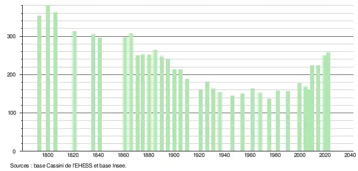L'évolution du nombre d'habitants est connue à travers les recensements de la population effectués dans la commune depuis 1793. Pour les communes de moins de 10 000 habitants, une enquête de recensement portant sur toute la population est réalisée tous les cinq ans, les populations de référence des années intermédiaires étant quant à elles estimées par interpolation ou extrapolation[14]. Pour la commune, le premier recensement exhaustif entrant dans le cadre du nouveau dispositif a été réalisé en 2004[15].