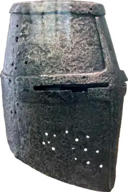 Le heaume est un casque de cavalerie médiéval en acier emblématique de la chevalerie, protégeant toute la tête.
