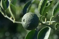 Le fruit ressemble au sudachi, avec une peau mince, peu ou pas de petits pépins, un diamètre d'environ 5 cm et un poids d'environ 70g[9] lors de sa récolte en vert. Il se reconnait par son absence d'aréole à la différence du sudachi et du yuzu vert et pas sa précocité..