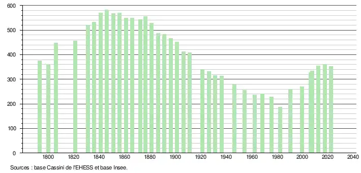 L'évolution du nombre d'habitants est connue à travers les recensements de la population effectués dans la commune depuis 1793. Pour les communes de moins de 10 000 habitants, une enquête de recensement portant sur toute la population est réalisée tous les cinq ans, les populations de référence des années intermédiaires étant quant à elles estimées par interpolation ou extrapolation[21]. Pour la commune, le premier recensement exhaustif entrant dans le cadre du nouveau dispositif a été réalisé en 2007[22].
