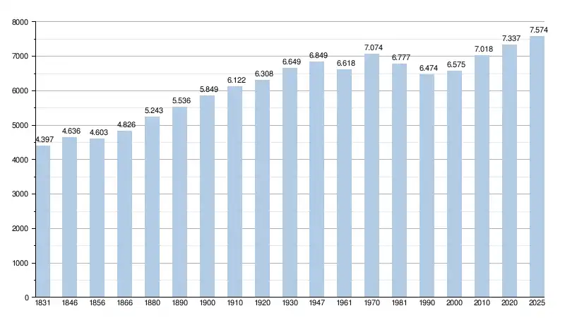 Graphe de l'évolution de la population de la commune. Les données ci-après intègrent les anciennes communes dans les données avant la fusion en 1977.