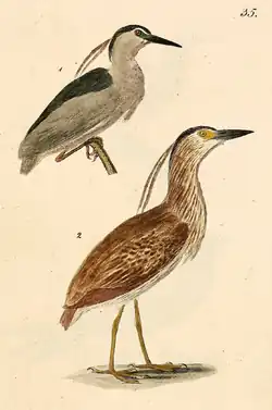 Ardea nycticorax (aujourd'hui Nycticorax nycticorax) et Ardea caledonica (aujourd'hui Nycticorax caledonicus crassirostris, sous-espèce de Nycticorax caledonicus) dessinés par Killitz