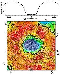 La région la plus creuse du bassin se trouve au fond d'un cratère situé en contrebas de Coronae Scopulus par 34,0° S et 65,6° E à 8 200 m sous le niveau de référence[8], où l'on a mesuré une pression atmosphérique de 1 155 Pa[9], supérieure de près de 90 % de la pression standard sur Mars (soit 610 Pa) et surtout supérieure à celle du point triple de l'eau (611,73 Pa), ce qui rend possible la présence, au moins temporaire, d'eau liquide dans cette région pour peu que la température y atteigne au moins 273,16 K (soit 0,01 °C) dans le cas de l'eau pure. Une température inférieure serait néanmoins suffisante pour de l'eau salée, ce qui serait justement le cas de l'eau martienne — de l'eau liquide existe sur Terre jusqu'à −24 °C, par exemple dans le très salé lac Don Juan, en Antarctique[10], et certaines saumures demeurent liquides à des températures encore plus basses, de même que certaines solutions d'acide sulfurique, comme la solution H2SO4•6,5H2O – H2O, dont l'eutectique gèle à une température légèrement inférieure à −60 °C[11].