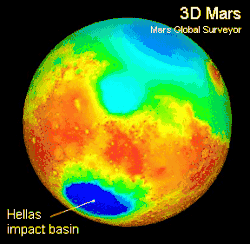 Bassin d'impact Hellas Planitia (en bas à droite). | ||