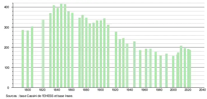 L'évolution du nombre d'habitants est connue à travers les recensements de la population effectués dans la commune depuis 1793. Pour les communes de moins de 10 000 habitants, une enquête de recensement portant sur toute la population est réalisée tous les cinq ans, les populations de référence des années intermédiaires étant quant à elles estimées par interpolation ou extrapolation[14]. Pour la commune, le premier recensement exhaustif entrant dans le cadre du nouveau dispositif a été réalisé en 2005[15].