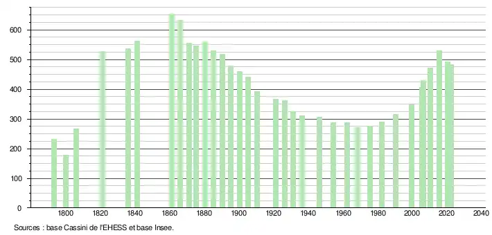 L'évolution du nombre d'habitants est connue à travers les recensements de la population effectués dans la commune depuis 1793. Pour les communes de moins de 10 000 habitants, une enquête de recensement portant sur toute la population est réalisée tous les cinq ans, les populations de référence des années intermédiaires étant quant à elles estimées par interpolation ou extrapolation[14]. Pour la commune, le premier recensement exhaustif entrant dans le cadre du nouveau dispositif a été réalisé en 2005[15].