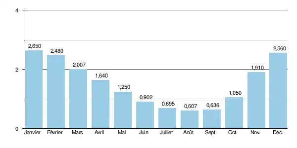 Le débit instantané maximal a été enregistré le et était de 60,70 m3/s tandis que le débit journalier maximal a été enregistré le de 20,40 m3/s. La hauteur maximale instantanée a été notée à 205 cm ou 2,05 m le [2].