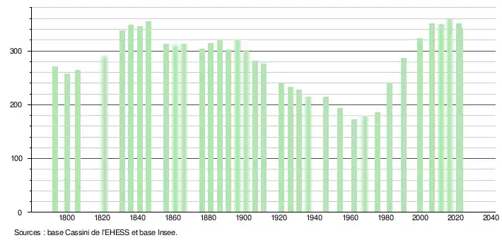 L'évolution du nombre d'habitants est connue à travers les recensements de la population effectués dans la commune depuis 1793. Pour les communes de moins de 10 000 habitants, une enquête de recensement portant sur toute la population est réalisée tous les cinq ans, les populations de référence des années intermédiaires étant quant à elles estimées par interpolation ou extrapolation[30]. Pour la commune, le premier recensement exhaustif entrant dans le cadre du nouveau dispositif a été réalisé en 2006[31].