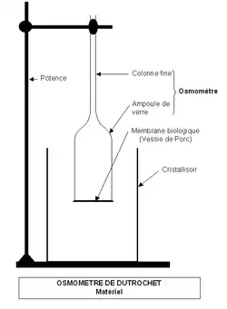 Un pas décisif qui rattacha ce mouvement de liquides à leur différence de composition fut franchi avec l'expérience suivante. Un cæcum de poulet lié en bourse, rempli d'une solution de NaCl ou de gomme, immergé dans l'eau, gonfle et augmente de poids. Les solutions étant inversées, le mouvement de l'eau se fait dans le sens contraire, l'eau du sac cæcal passant dans le bain extérieur. La paroi n'a donc pas de polarité. L'osmose, ou endosmose, phénomène rapide où la solution concentrée attire l'eau, rien que l'eau, fut un temps opposé à l'exosmose due à la diffusion transmembranaire de solutés entraînant un retour d'eau dans le compartiment d'origine lié aux modifications physico-chimiques des solutions initiales. L'osmomètre construit par Dutrochet permit de mesurer et d'étudier le phénomène et de prévoir son rôle en physiologie.
