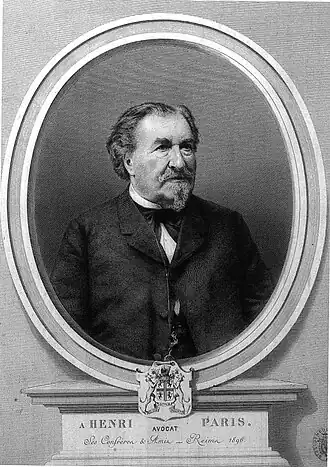 Henri Paris, bâtonnier de l’ordre des avocats de Reims, conseiller général, président du comité royaliste de la Marne, est maire de Reims de février à décembre 1874.