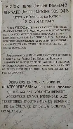 A la faculté de droit de Bordeaux, un amphithéâtre porte le nom d'Henry Vizioz, ainsi que plusieurs rues de la Métropole. Une plaque commémore dans le hall d'entrée de la Faculté de droit, place Pey-Berland, la disparition en mer des professeurs Vizioz et Bernard.