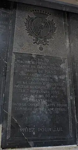 Il fut par ailleurs le bienfaiteur de la commune de Hans et le restaurateur de son église, où se trouve le caveau de sa famille, dont il fit consacrer le titre de Notre-Dame du Soldat par Mgr Sourrieu, évêque de Châlons, et confirmer par le pape Léon XIII.