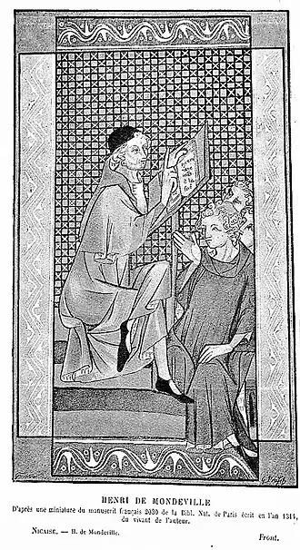 - ↑ Philippe Icard, « Henri de Mondeville (1260-1325), « le père méconnu de la chirurgie française » : Les Raisons de l'oubli ? », Mémoires de l’Académie nationale de chirurgie, vol. 9, no 2, , p. 13 (lire en ligne).