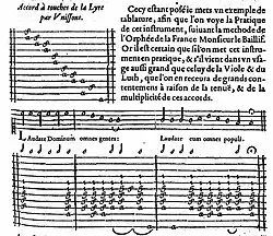 - Un court motet Laudate Dominum omnes gentes pour une voix et tablature de lyre[23], publié dans l’Harmonie universelle de Marin Mersenne en 1636 (p. 207 du Livre quatrième des Instrumens à cordes et reprise p. 53 de ses Harmonicorum instrumentorum libri IV.